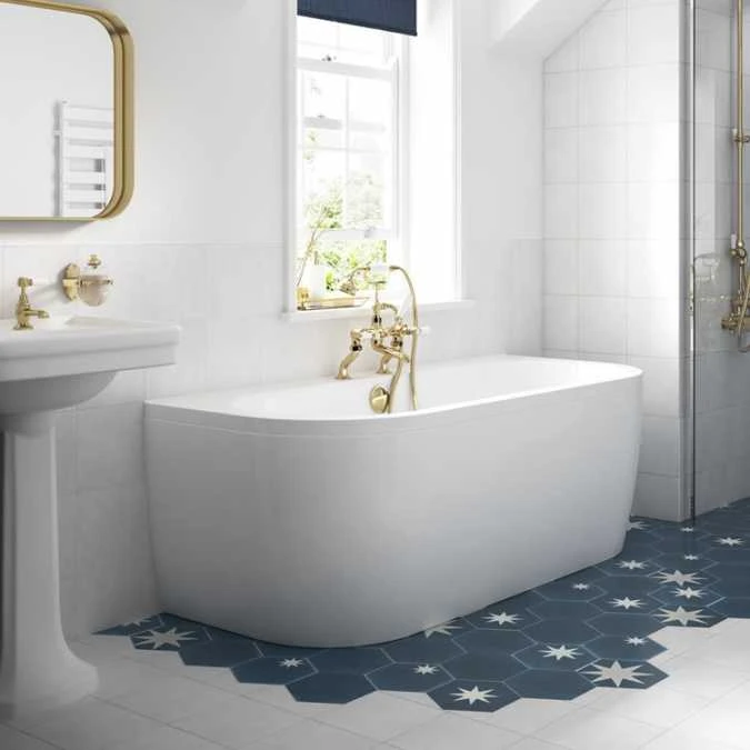The Solidblue Monreale back-to-wall double ended acrylic bath comes with plenty of space to mount taps and can be paired with an overflow filler for a minimalist look.