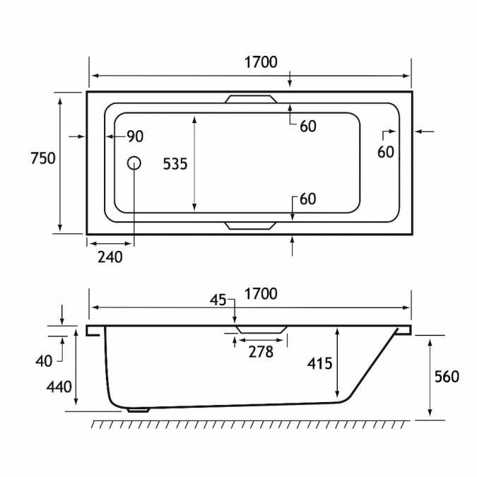 Beaufort Portland 5mm 1700 x 750mm Single Ended Twin Grip Bath.