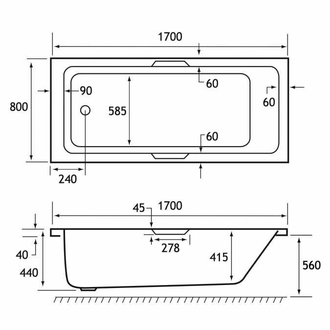 Beaufort Portland 5mm 1700 x 800mm Single Ended Twin Grip Bath.