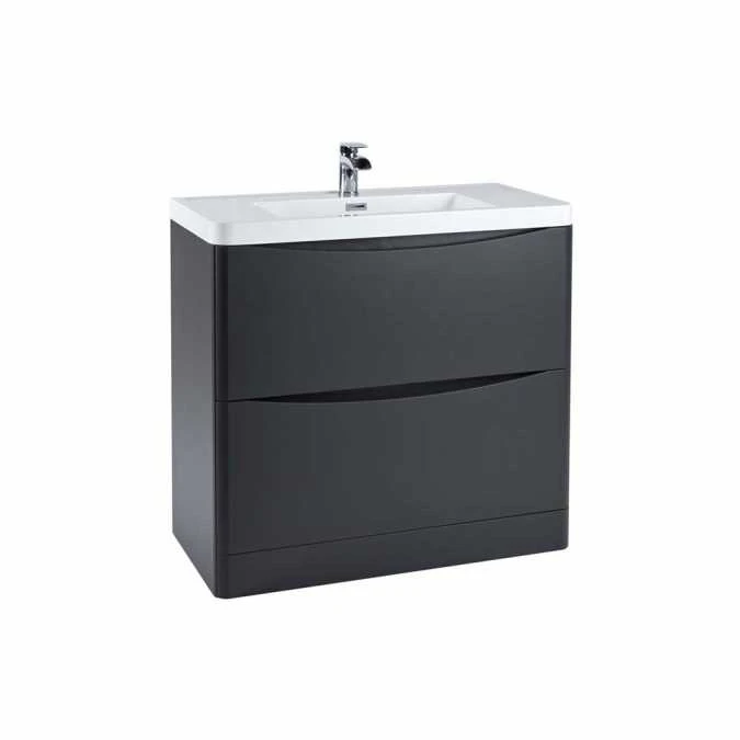 The Bella 900 floor cabinet in matt grey from Scudo offers ample storage space with two 900mm wide soft close drawers, each having recessed cut out handles.