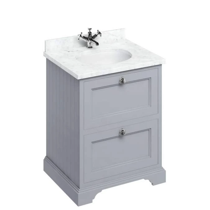 The Burlington Grey 65cm two-drawer vanity unit comes with a classic basin or a choice of 3 stunning Minerva worktops – White, Carrara White Marble or Black Granite.  Each worktop has an integrated basin with built in overflow..  Â