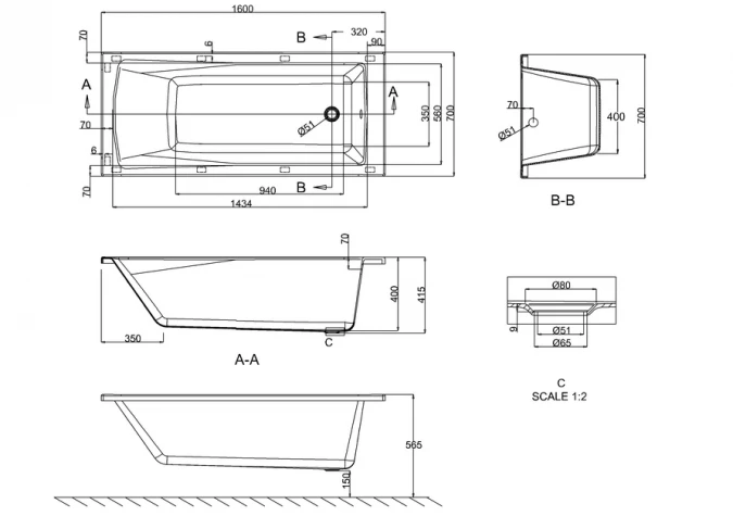- Displaced capacity: 98 litres (bath’s capacity less 70 litres)