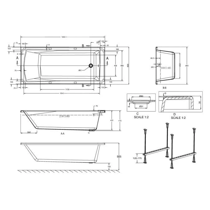 - Displaced capacity: 148 litres (bath’s capacity less 70 litres)