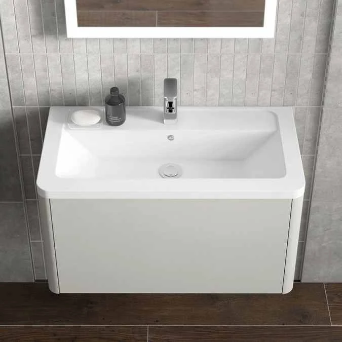 The Nara 600mm vanity unit with curved basin by Elation Bathrooms brings clean minimalist style into your bathroom. The blend of curved edges with an uncluttered aesthetic offers a softer approach to minimalist trends. Bold continuous lines and handleless units provide the perfect canvas to inject your individual style.