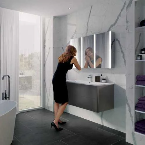 This HIB Xenon 120 LED Aluminium Cabinet is a bathroom cabinet with soft close double sided mirror doors, Charging Socket, Sensor switch operated.