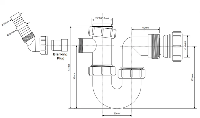 - Supplied with an 1½” x 75mm water seal tubular swivel ‘p’ trap