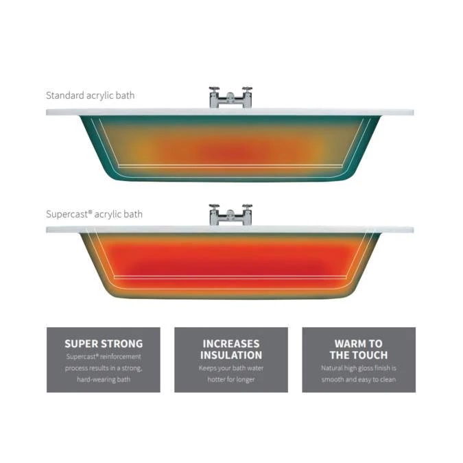 This Overberg DOUBLECAST P shaped shower bath is manufactured using a substantial reinforcement process making the baths incredibly strong, hard-wearing and able to retain heat longer than a typical acrylic bath. This gives you the assurance of an old cast iron bath with the natural warmth and quality acrylic brings.
